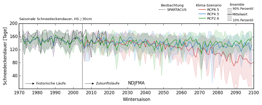 Fallbeispiel: Zeitreihe der modellierten saisonalen (NDJFMA) Schneedeckendauer (Schneehöhe größer oder gleich 30cm) basierend auf RCP8.5, RCP4.5 und RCP2.6. Die durchgezogenen Linien zeigen das Ensemblemittel an. Die Abschattung stellt die 10 und 90% Perzentile über die Verteilung der einzelnen Ensemblemitglieder dar. Die gestrichelte Linie stellt die Simulation dar, die unter Verwendung des gerasterten Beobachtungsdatensatzes SPARTACUS durchgeführt wurde. Die Simulationen gelten für einen Punkt mit einer Höhe von ca. 2400 m ü.d.M. im Skigebiet.