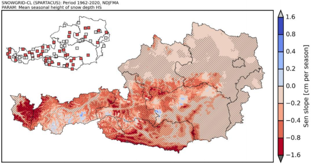 Die Grafik (Abbildung 1) zeigt den Trend der mittleren Schneehöhe in Österreich seit 1962. Nahezu im gesamten Bundesgebiet ist eine Abnahme der Schneehöhe festzustellen (rote Bereiche).