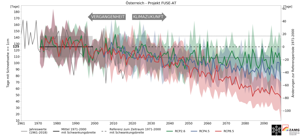 Ohne Klimaschutz ist langfristig der stärkste Rückgang der Schneelage zu erwarten. Diese Grafik (Abbildung 2) zeigt die Änderung der Schneedeckendauer gemittelt über die gesamte Fläche Österreichs (und somit über alle Höhenlagen). Verglichen wird mit dem Durschnitt des Zeitraums 1971–2000. RCP8.5 bezeichnet das Szenario ohne Klimaschutz, RCP4.5 mit mäßigem Klimaschutz und RCP2.6 das sogenannte Paris-Ziel mit einer Erwärmung unter 2 Grad.